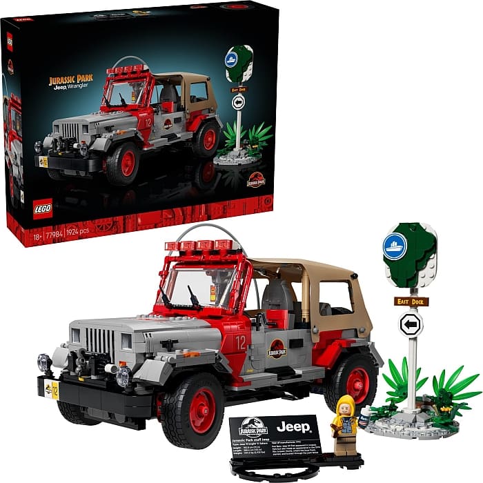 Share your love for iconic movie vehicles or LEGO building with an impressive display in the #77984 LEGO Jurassic Park Jeep Wrangler set. This collectable piece features a 1:10-scale, customizable Jeep Wrangler model car, designed for adults aged 18 years old and over. The set has an array of functions, including opening doors, bonnet, removable canvas roof, roll bars, and a working winch. Boxes can be installed on the back, and the car can be steered using the spare tire. Accessories include an information plaque with a stand, a direction sign, a Dennis Nedry minifigure from the 1993 Jurassic Park movie, and more. Set contains 1,924 pieces. Price: 199.99 USD / 199.99 EUR / 179.99 GBP. Available from May 7th at the LEGO Jurassic World section of the Online LEGO Shop.