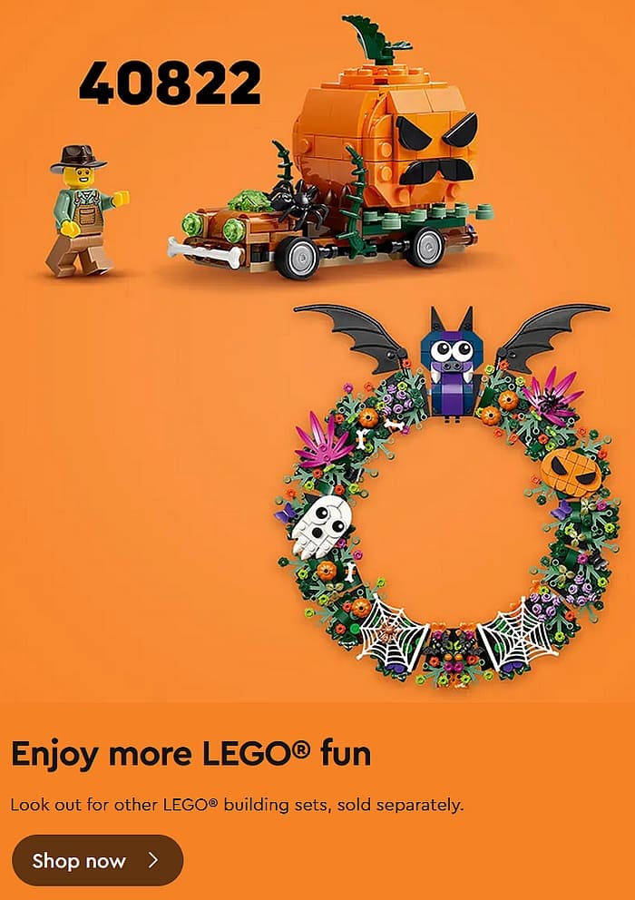 #40822 LEGO JACK-O-LANTERN PICKUP: This cute set features a pickup truck driven by a farmer minifig with a large scary pumpkin on the back. Open the pumpkin at the top to store another pumpkin head and a skull inside. Use it alone as a Halloween decoration, or add it to your LEGO city display. Price: $19.99. Available at the seasonal items section of the Online LEGO Shop.