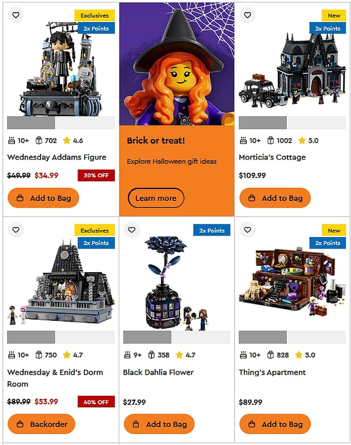 LEGO WICKED SETS: In a similar vein, LEGO is also recommending the LEGO Wicked sets for Halloween. These are more colorful than the Wednesday sets, but they both feature some slightly scary-looking mini-dolls. They also have some really interesting decorative elements that can be very useful for custom projects. You can find them at the LEGO Wicked section of the Online LEGO Shop.