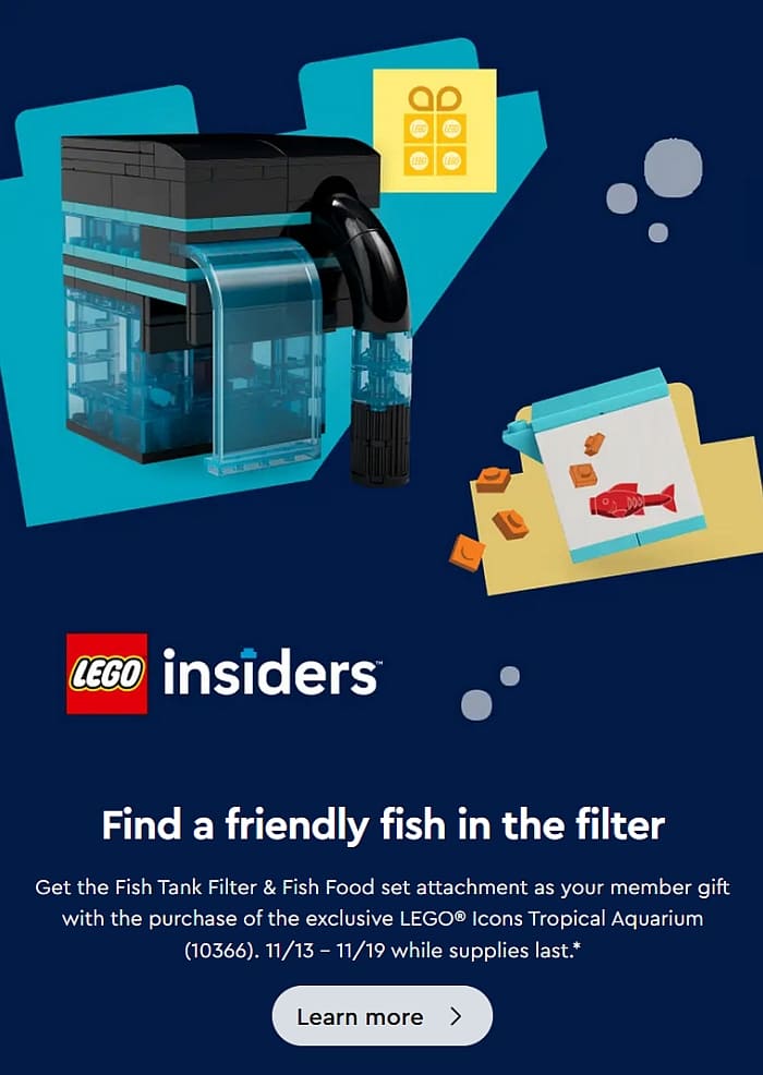 And just when you thought the LEGO Icons Tropical Aquarium couldn’t get any cooler, you will be able to expand the set with the #5009823 LEGO Fish Tank Filter & Fish Food set. The filter sits outside the main tank with its intake tube and water spill positioned inside. You’ll also spot a stray fish that has wandered inside the filter. A box of fish food decorated with a hungry LEGO fish completes the scene. This set will be available as a freebie with the purchase of the LEGO Icons Tropical Aquarium, November 13-19th at the LEGO Icons section of the Online LEGO Shop.