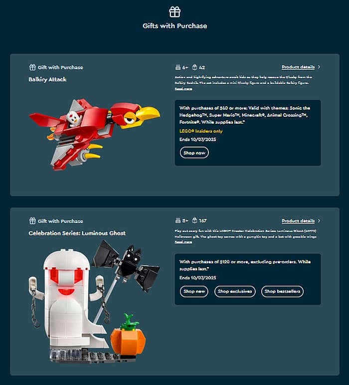 Another freebie is the #30704 Sonic the Hedgehog Balkiry Attack with purchases of $40 or more of LEGO Sonic the Hedgehog, LEGO Super Mario, LEGO Minecraft, LEGO Animal Crossing, and LEGO Fortnite sets. This offer is also valid until October 7th at the Online LEGO Shop.