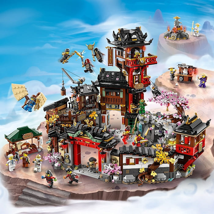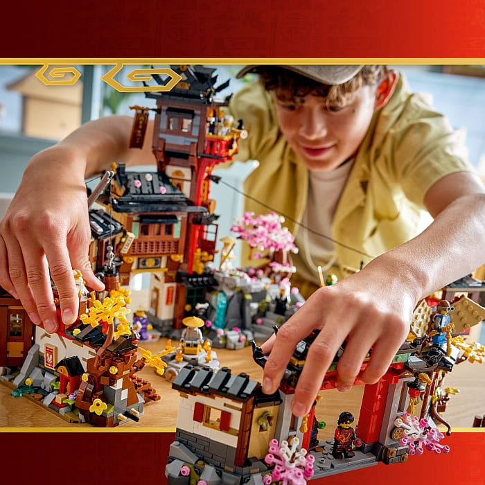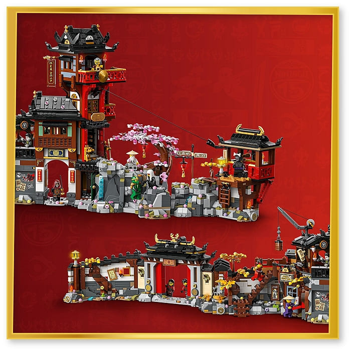 The set is packed with nostalgic references and features a zip line for minifigures to travel along, a working crane, a tea cart, a carpenter’s workshop, an exploding wall, a statue of the First Spinjitzu Master, cherry blossom trees, a hidden entrance, ninja artifacts, and a secret hideout.