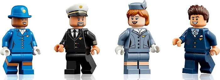 Adding to its display-worthy appeal, the model includes four exclusive minifigures: a pilot, purser, stewardess, and flight attendant, all wearing historically inspired PAN AM uniforms. Once complete, the aircraft can be showcased on a sturdy display stand with an information plaque, alongside a dedicated PAN AM-branded minifigure display, making it a prized collectible for aviation and LEGO enthusiasts alike.